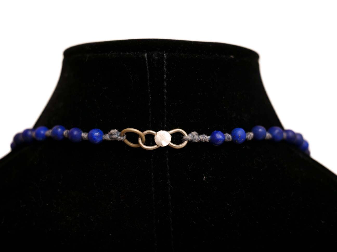 The necklace also contains round, roughly carved and polished lapis lazuli beads with star designs on them that represent the artist’s beliefs, and are said to bring good luck to its wearer.