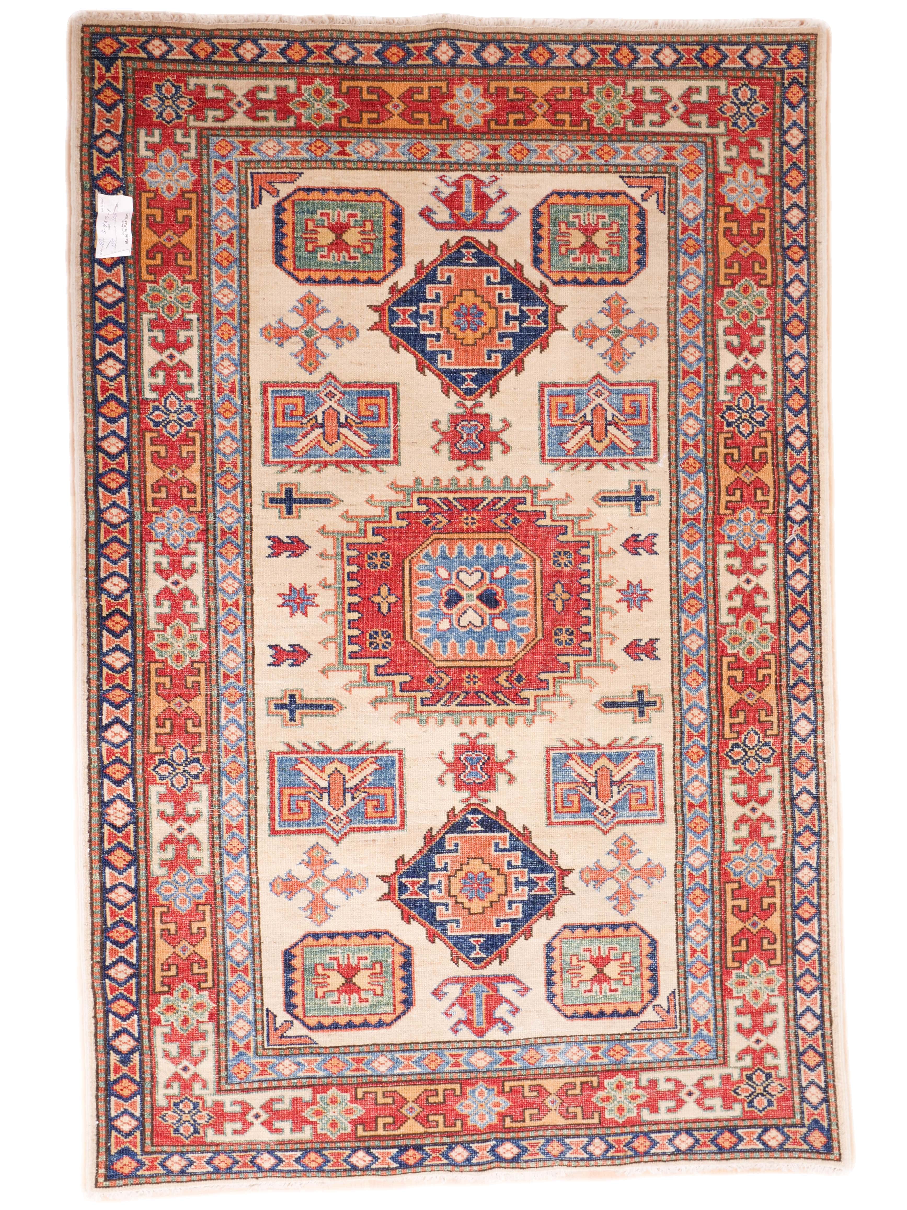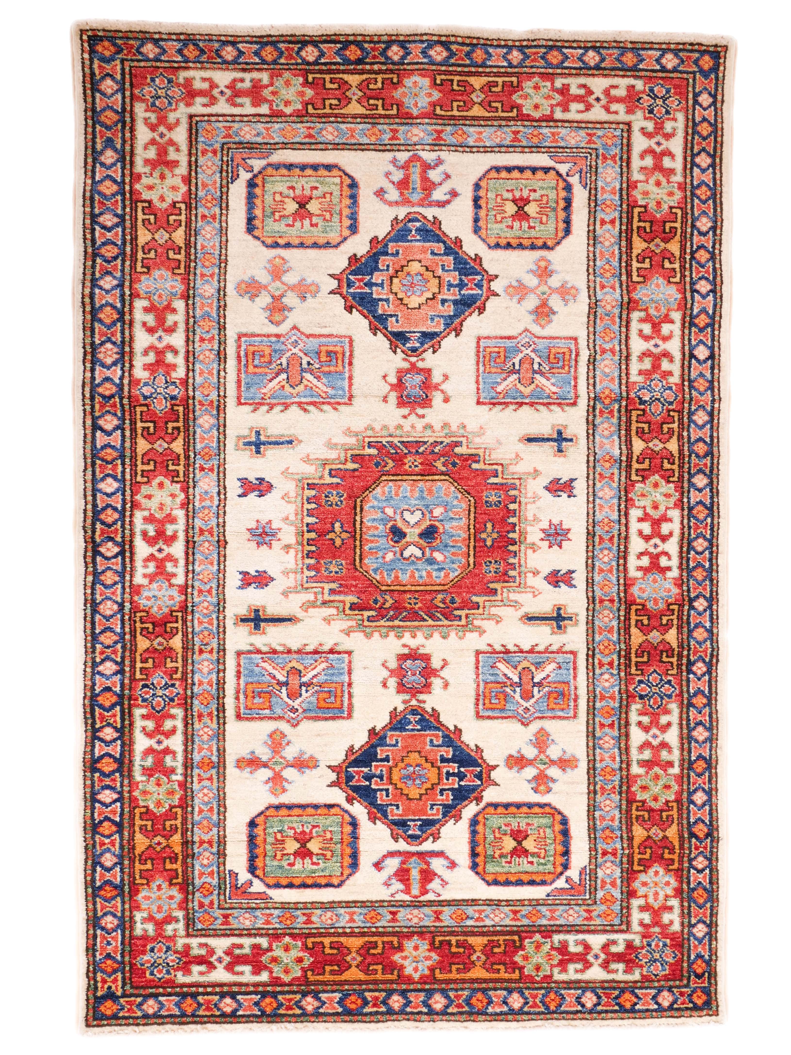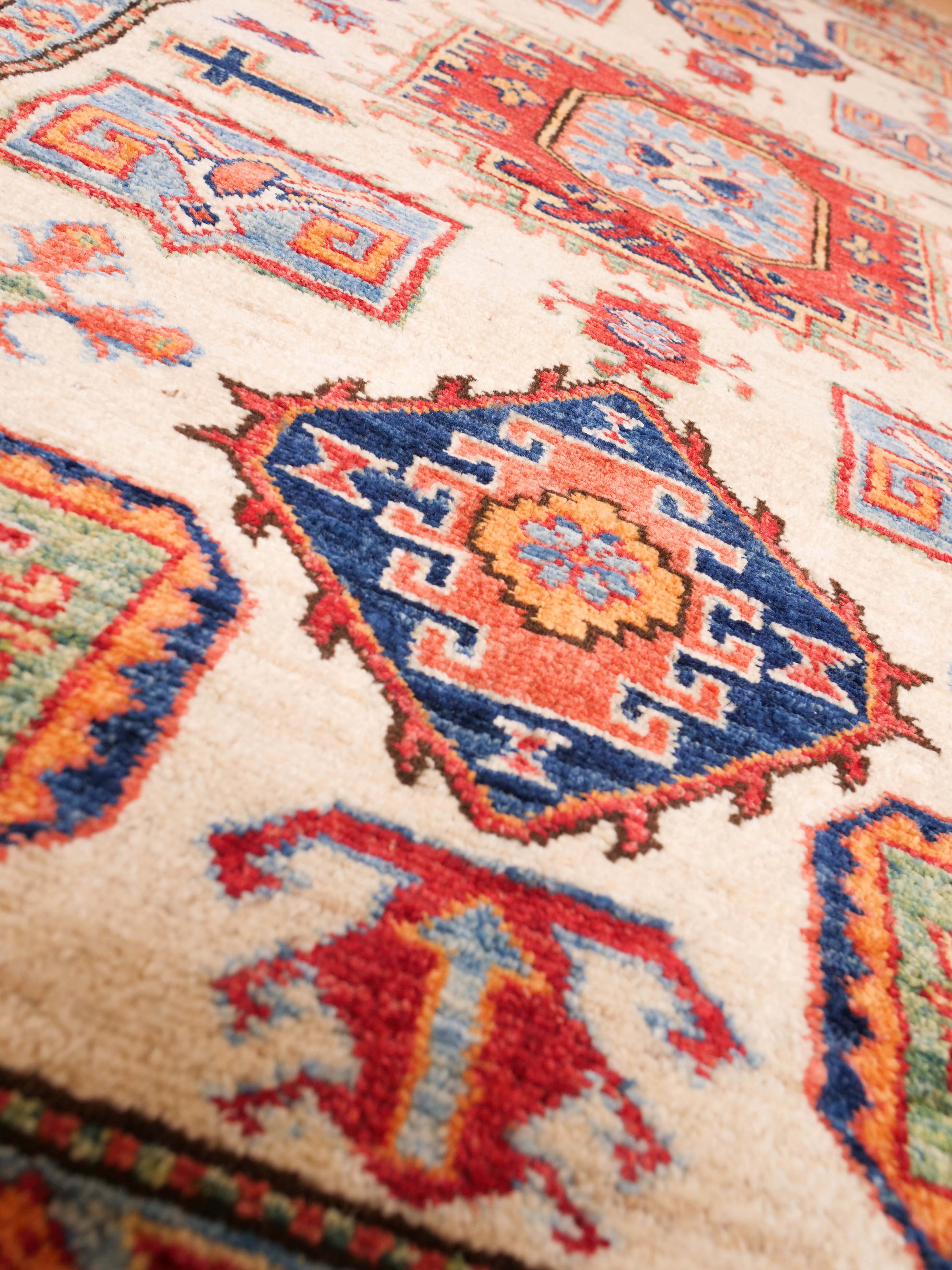 The very famous geometric designs come from Kazakhstan and were used for rugs like this for many years. The symbols are meant to convey good luck and good energy. The knots are very tight, and the pile was cut very low in order to show the design in great clarity.
