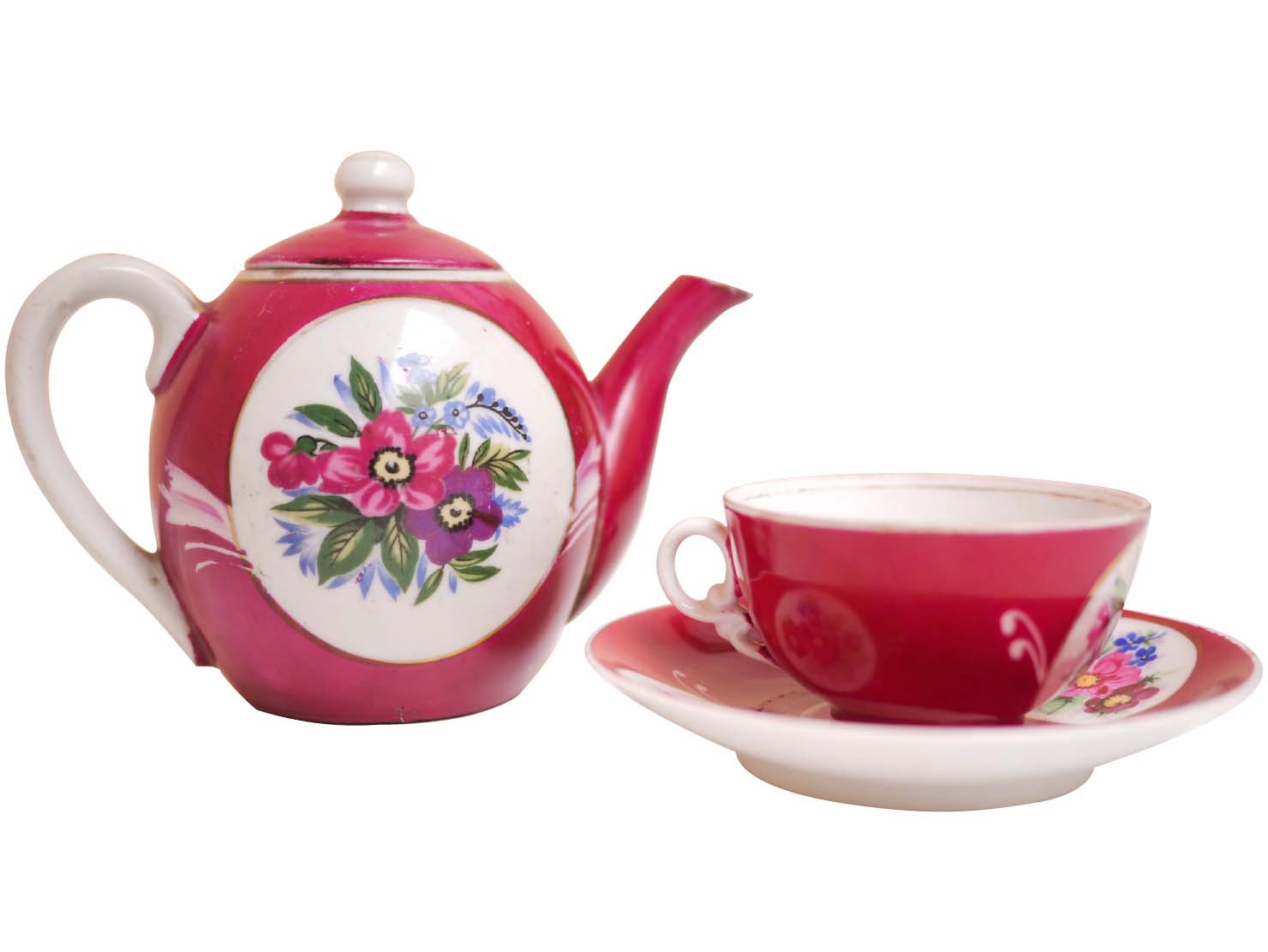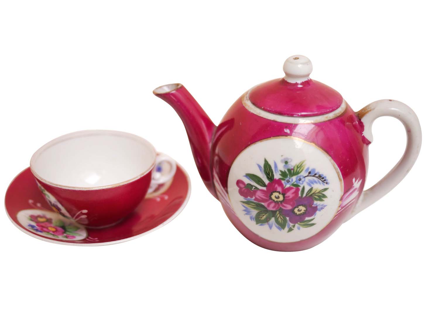 This authentic, hand-made Gardener tea set includes a matching tea pot, saucer, and tea cup. The saucer has a 5” diameter and the teacup has a 3” diameter.