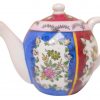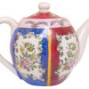 This teapot has a one-of-a-kind design of half-red, half-blue background with flowers.
