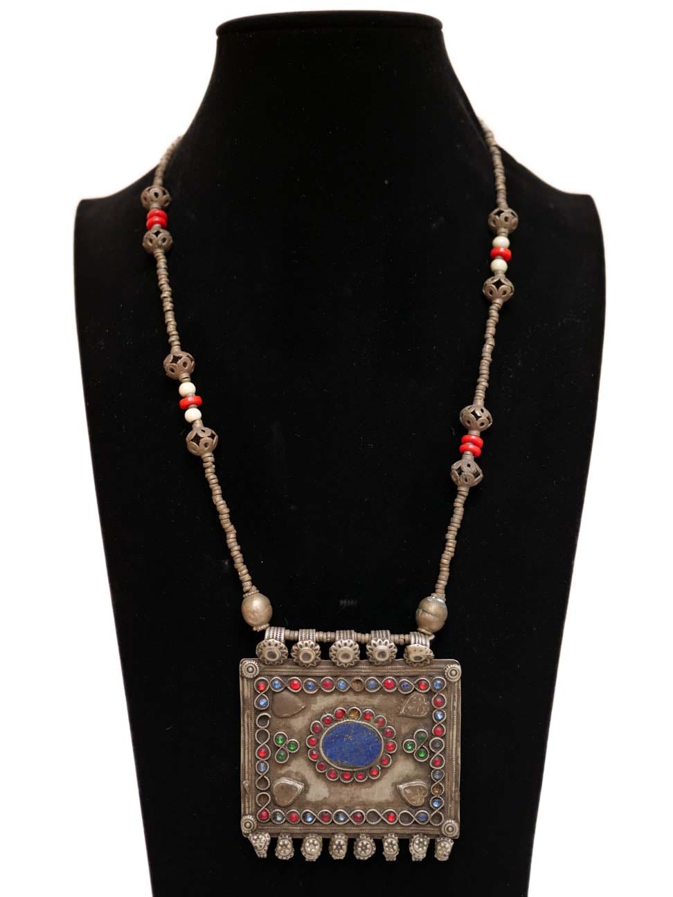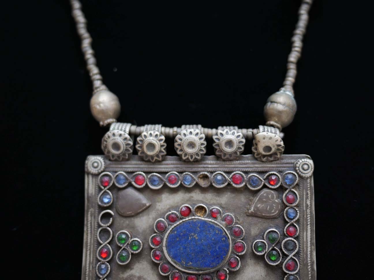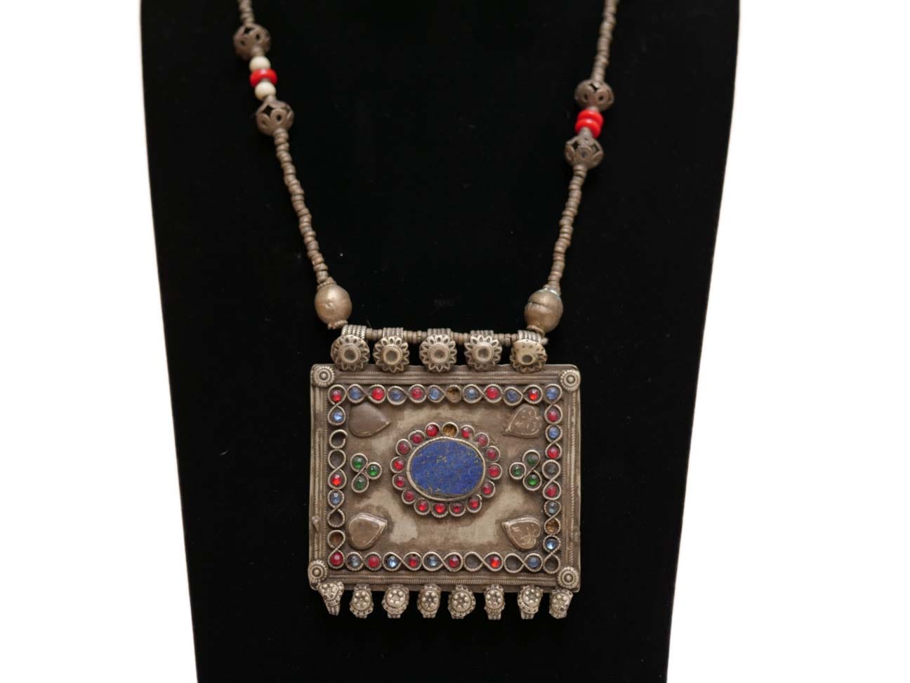 This Kuchi Necklace was worn by the nomads of South Afghanistan. It is made from German silver and features a center piece of Lapis Lazuli.