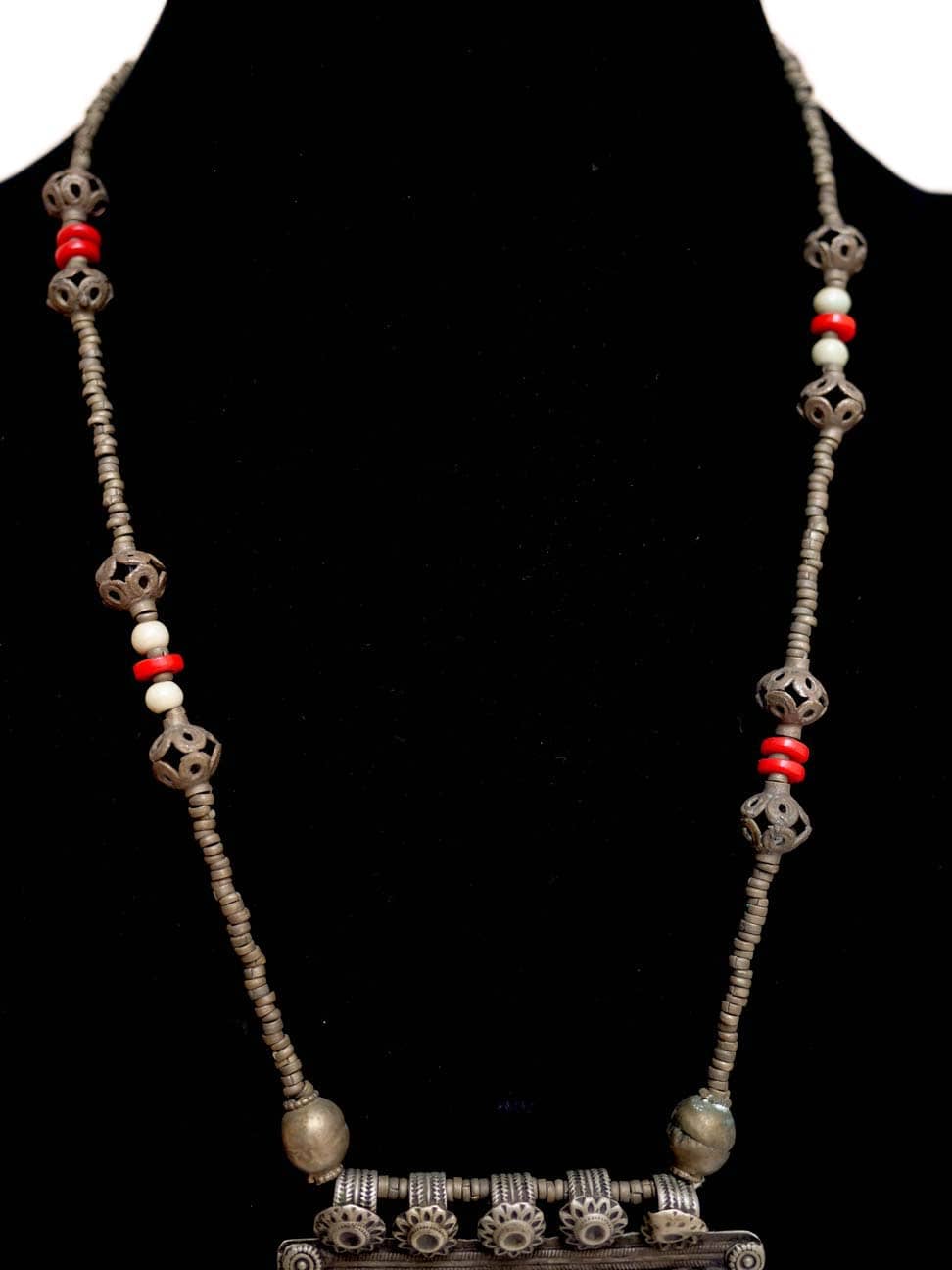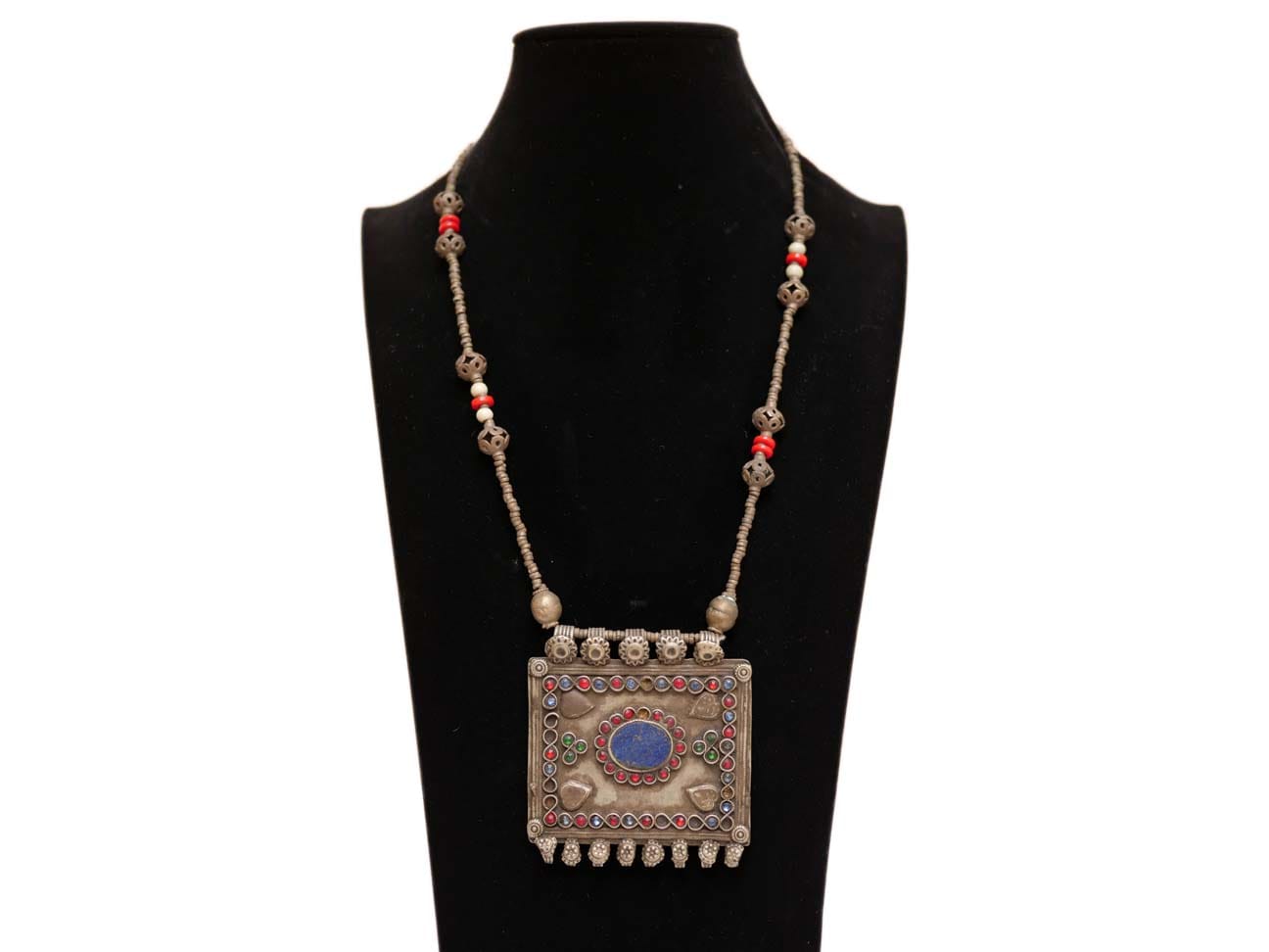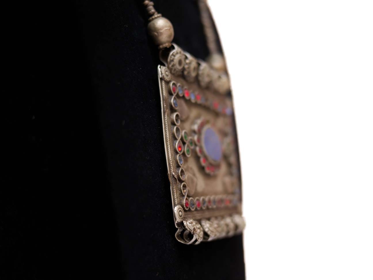 This Kuchi Necklace was worn by the nomads of South Afghanistan. It is made from German silver and features a center piece of Lapis Lazuli.