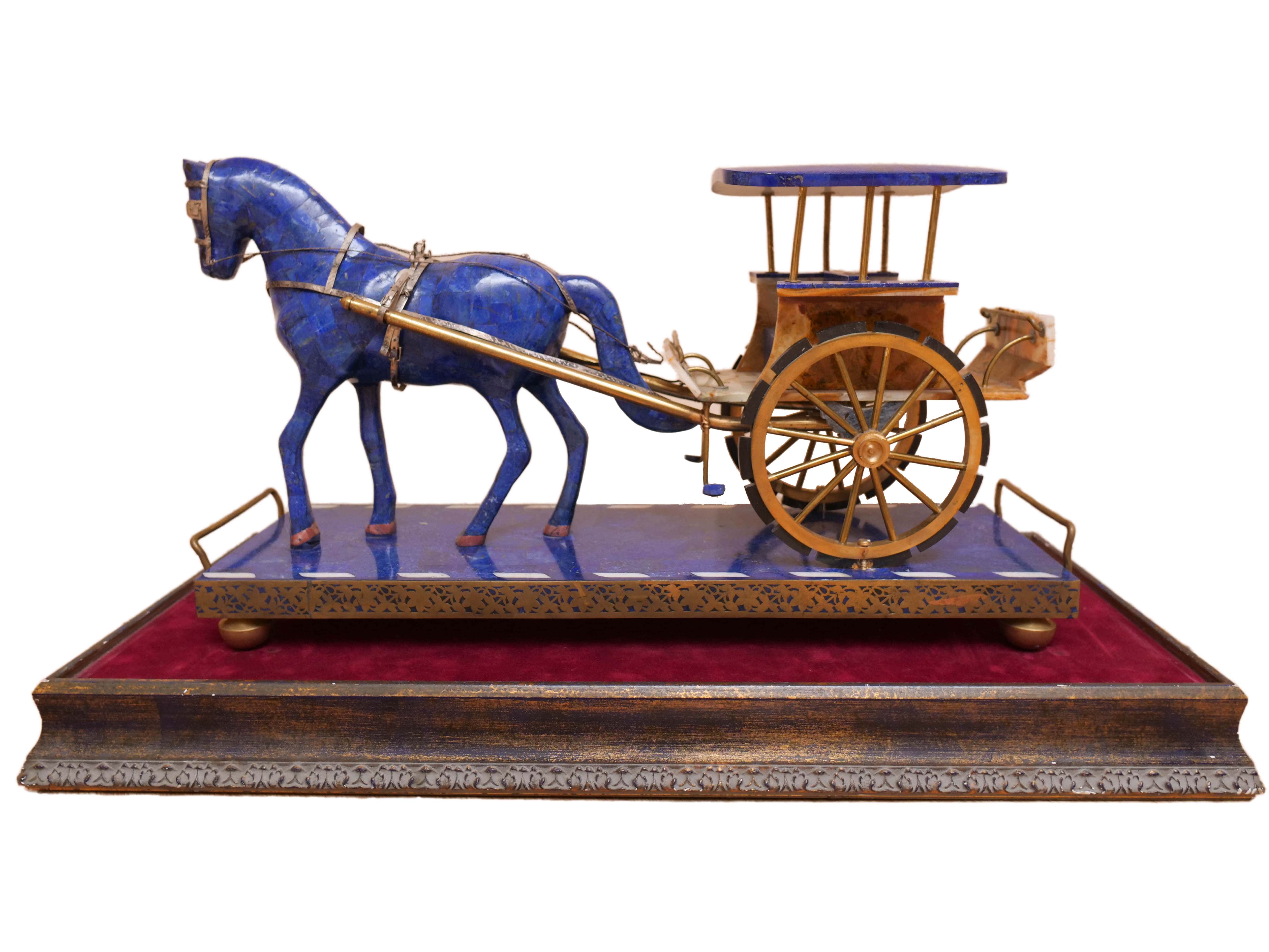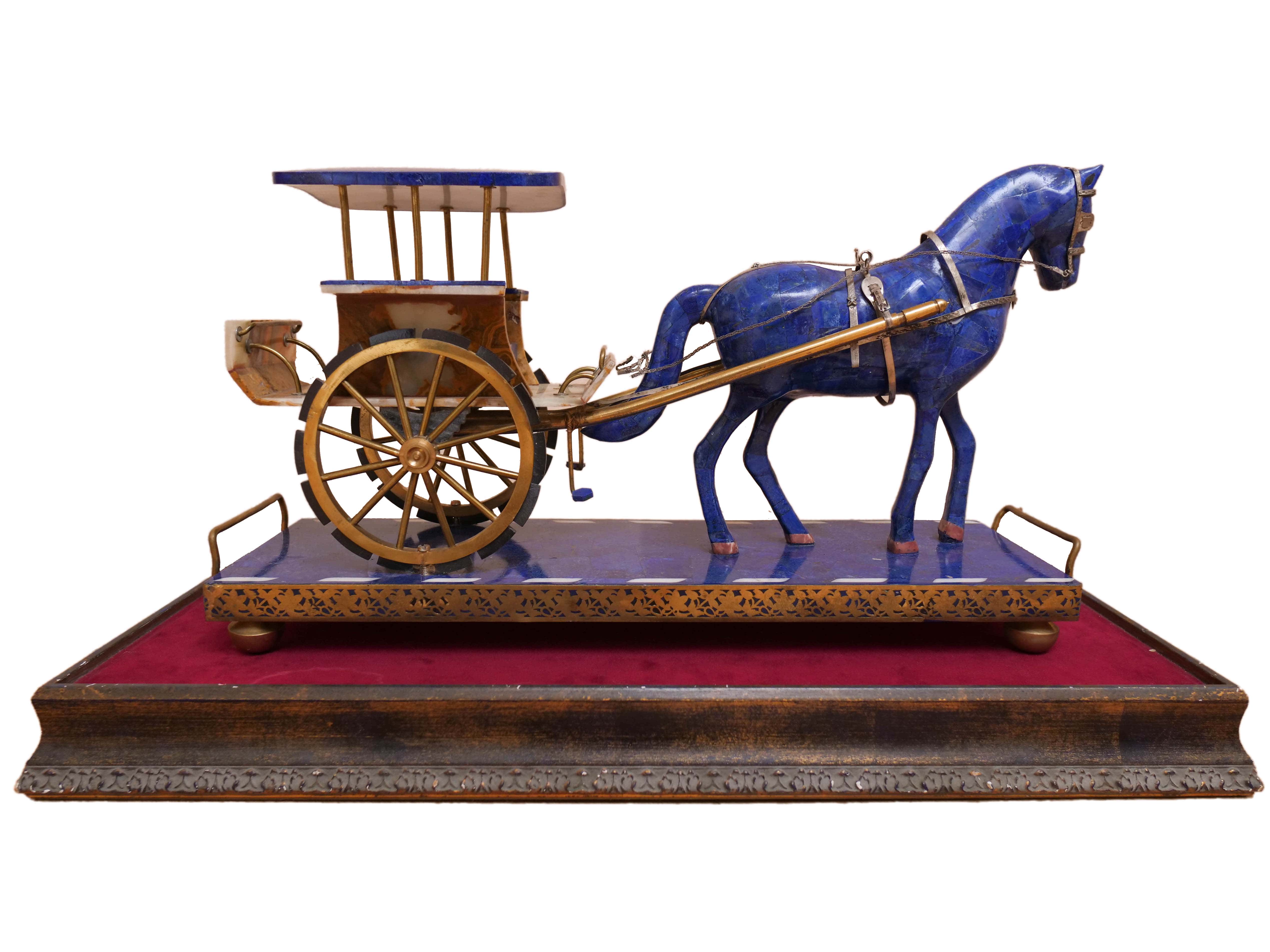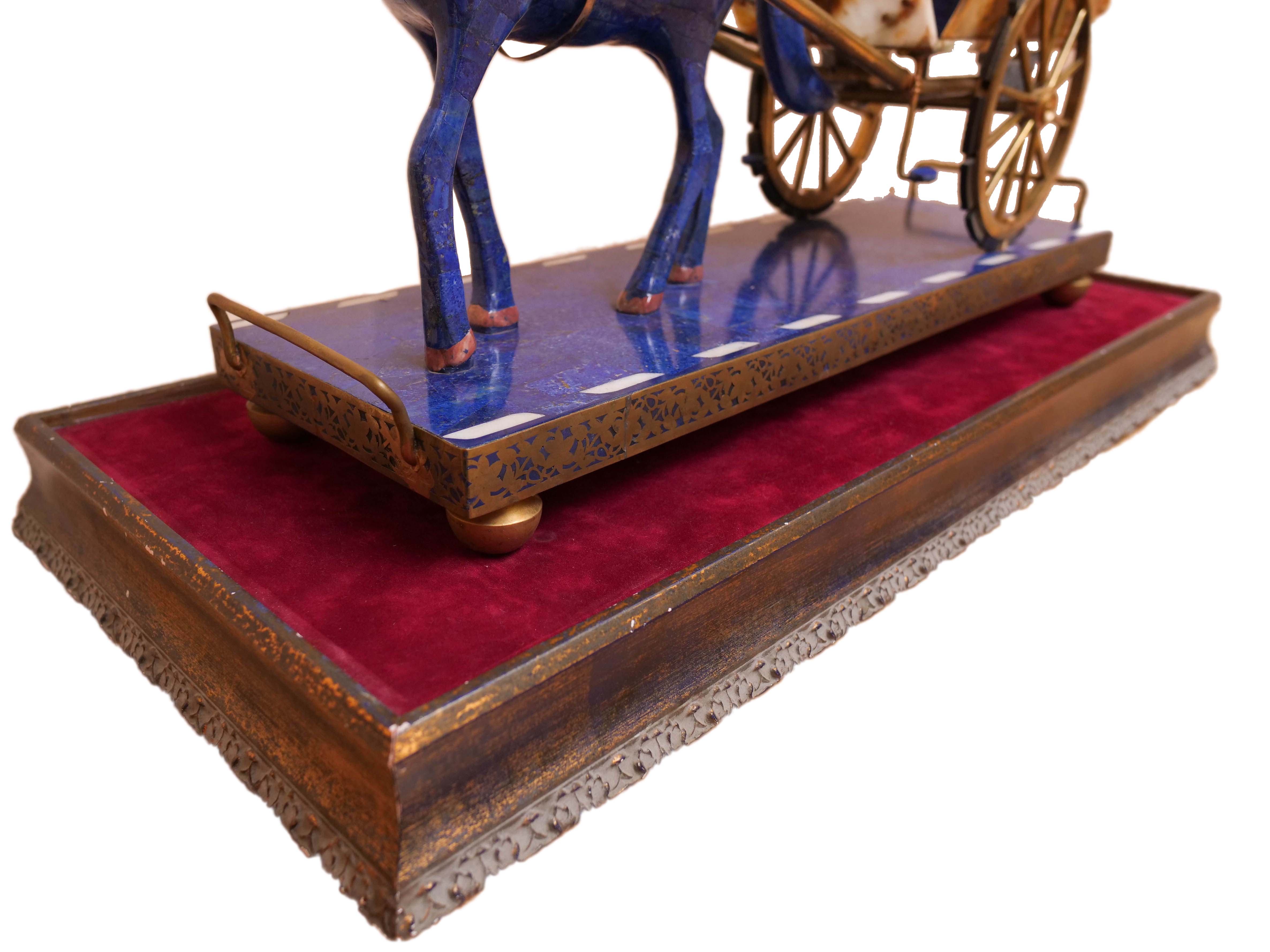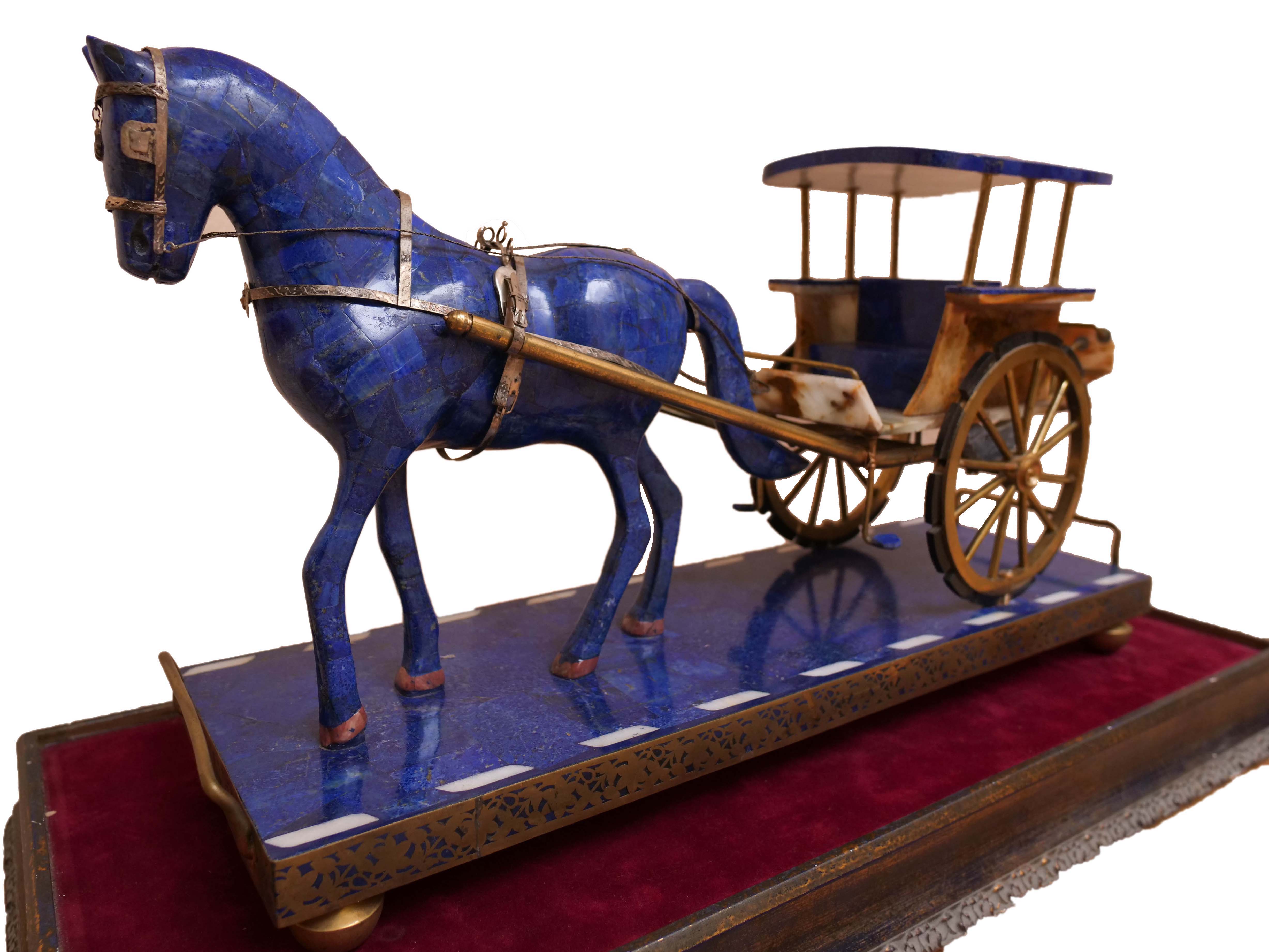 This incredible lapis lazuli horse and carriage statue was handmade in a workshop in Kabul, Afghanistan. It took the original master artists, approximately four of them, about a year to construct.