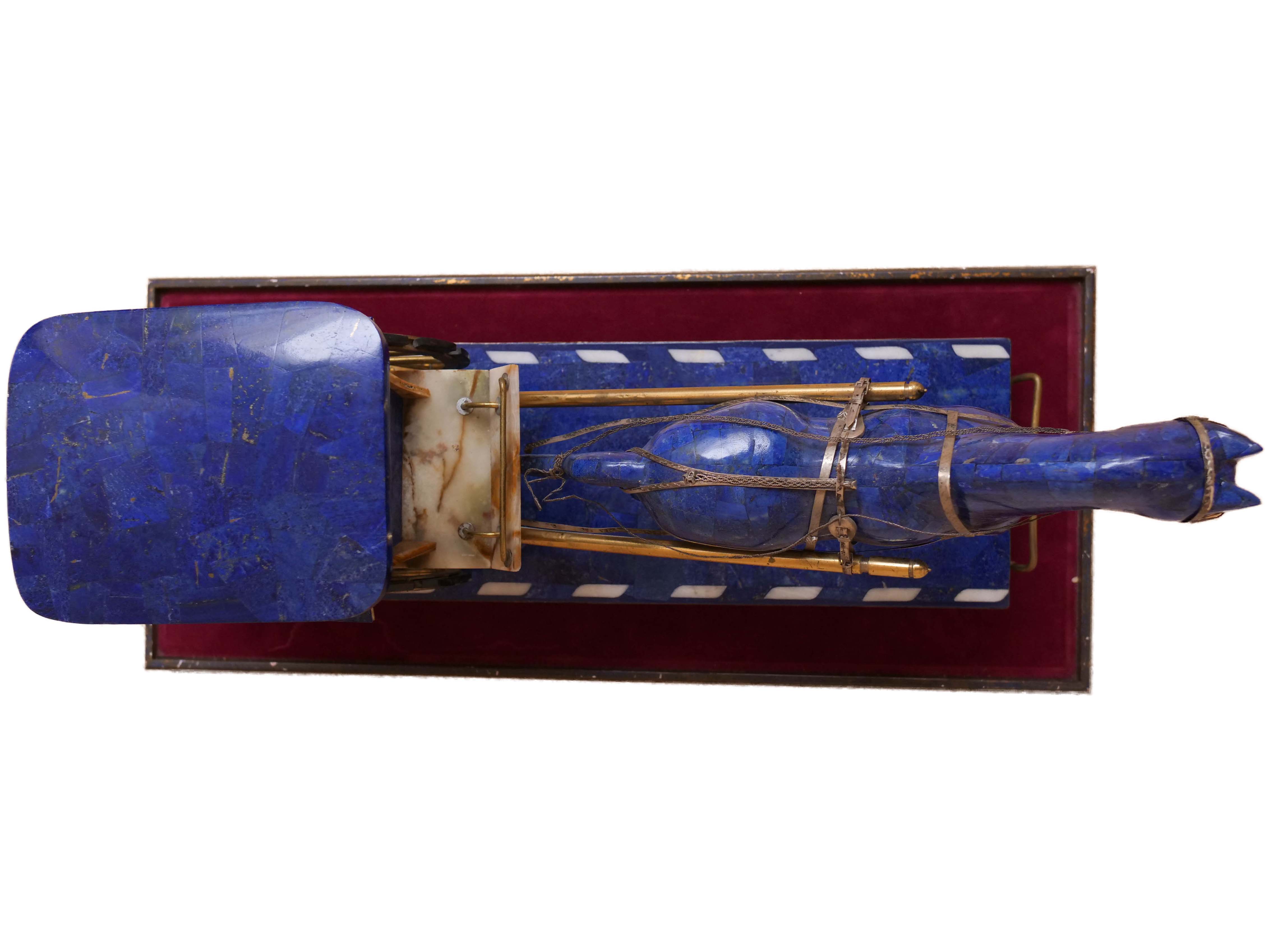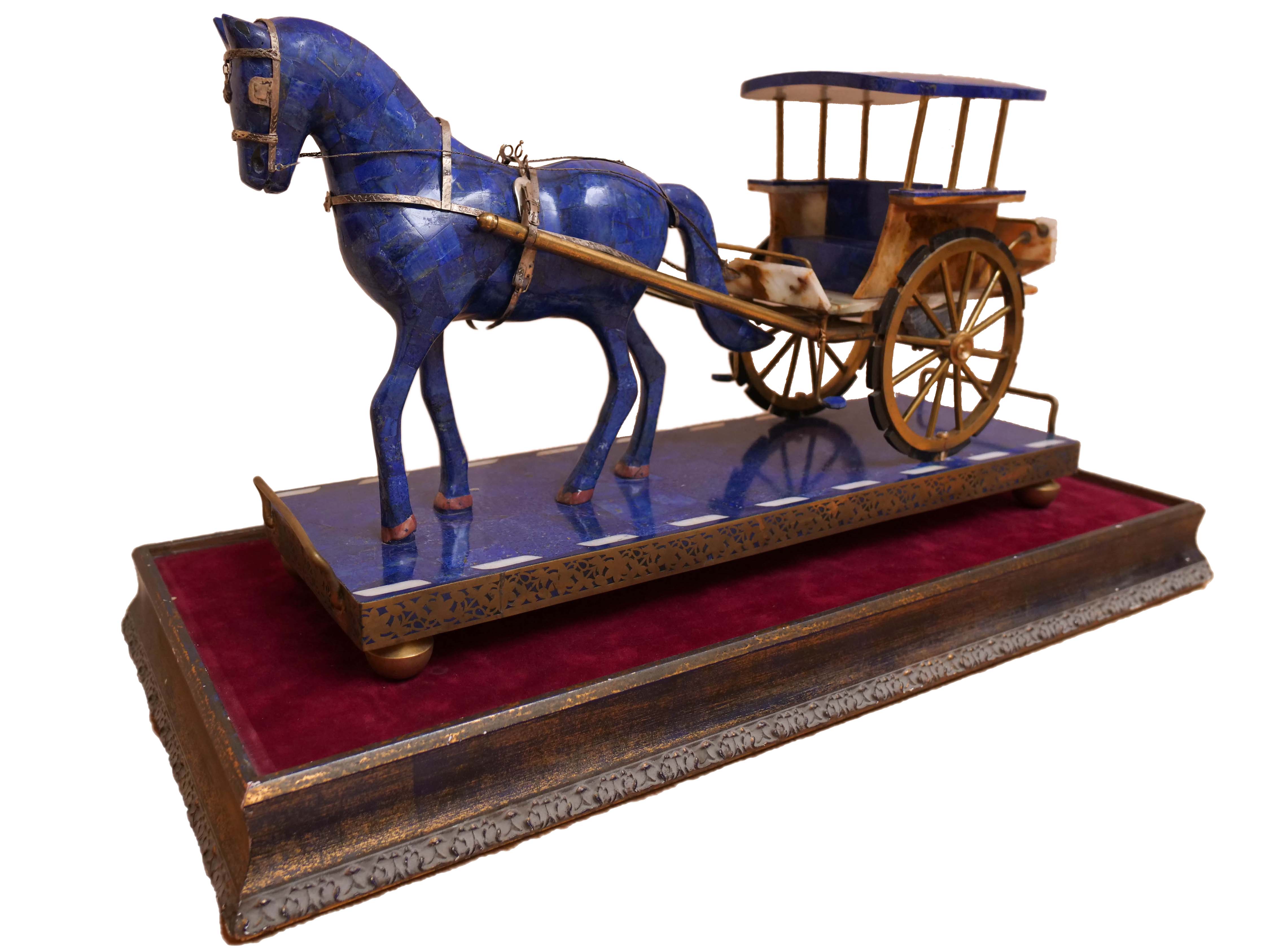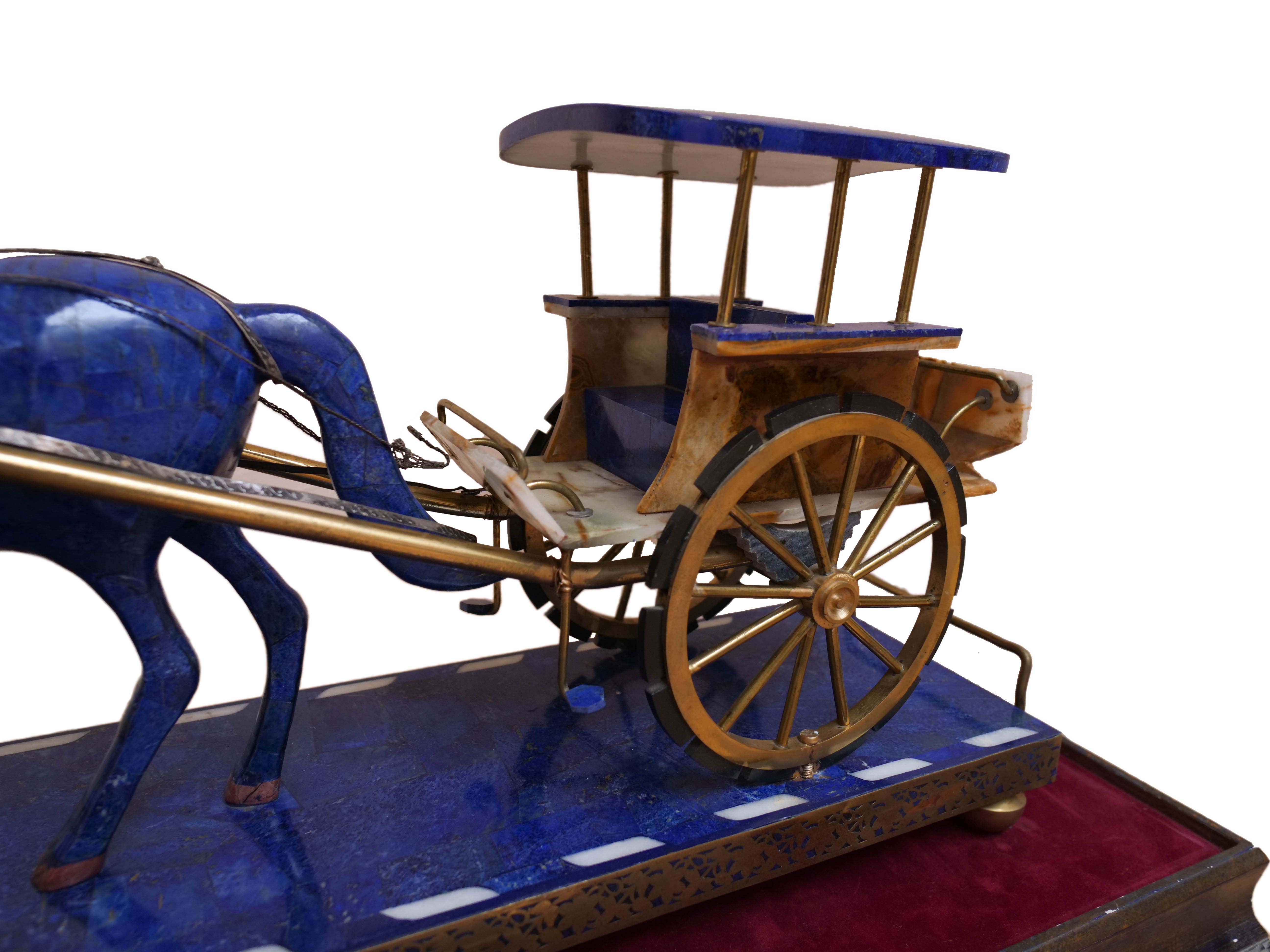The steps on the carriage are made from marble sourced from the mines of Afghanistan. The horse and carriage are set on a solid piece of lapis lazuli that even has the road markers inlaid into it.