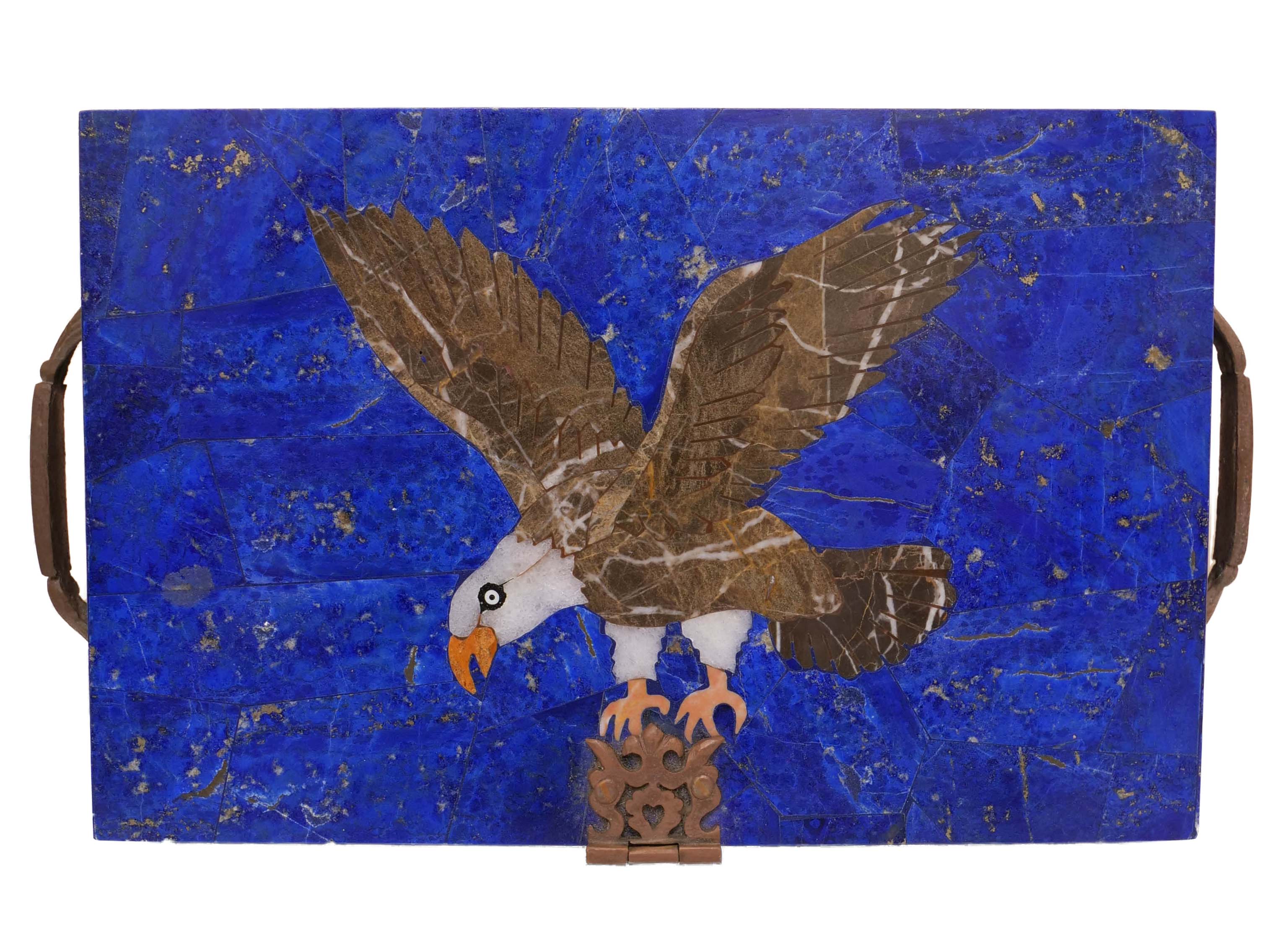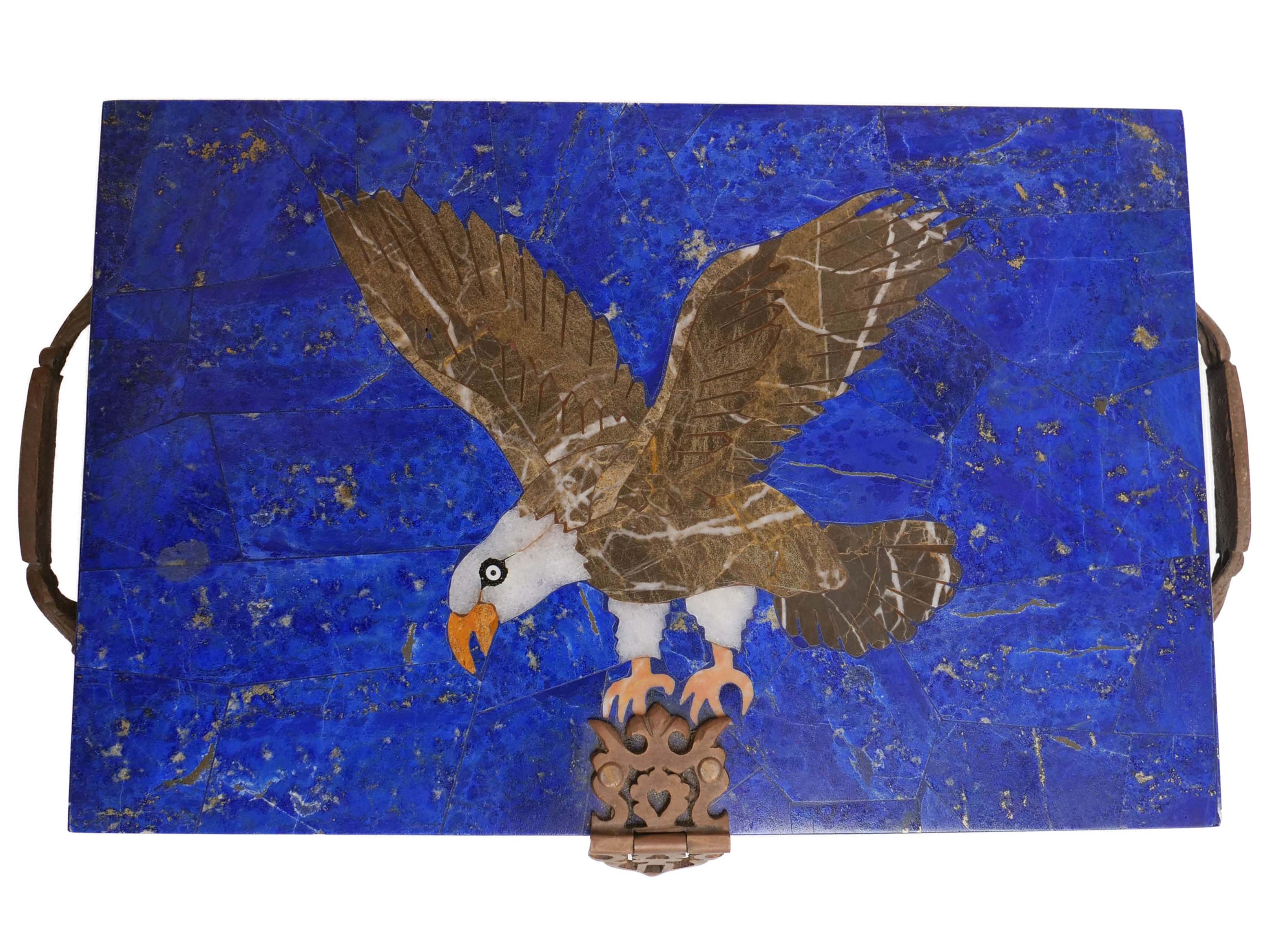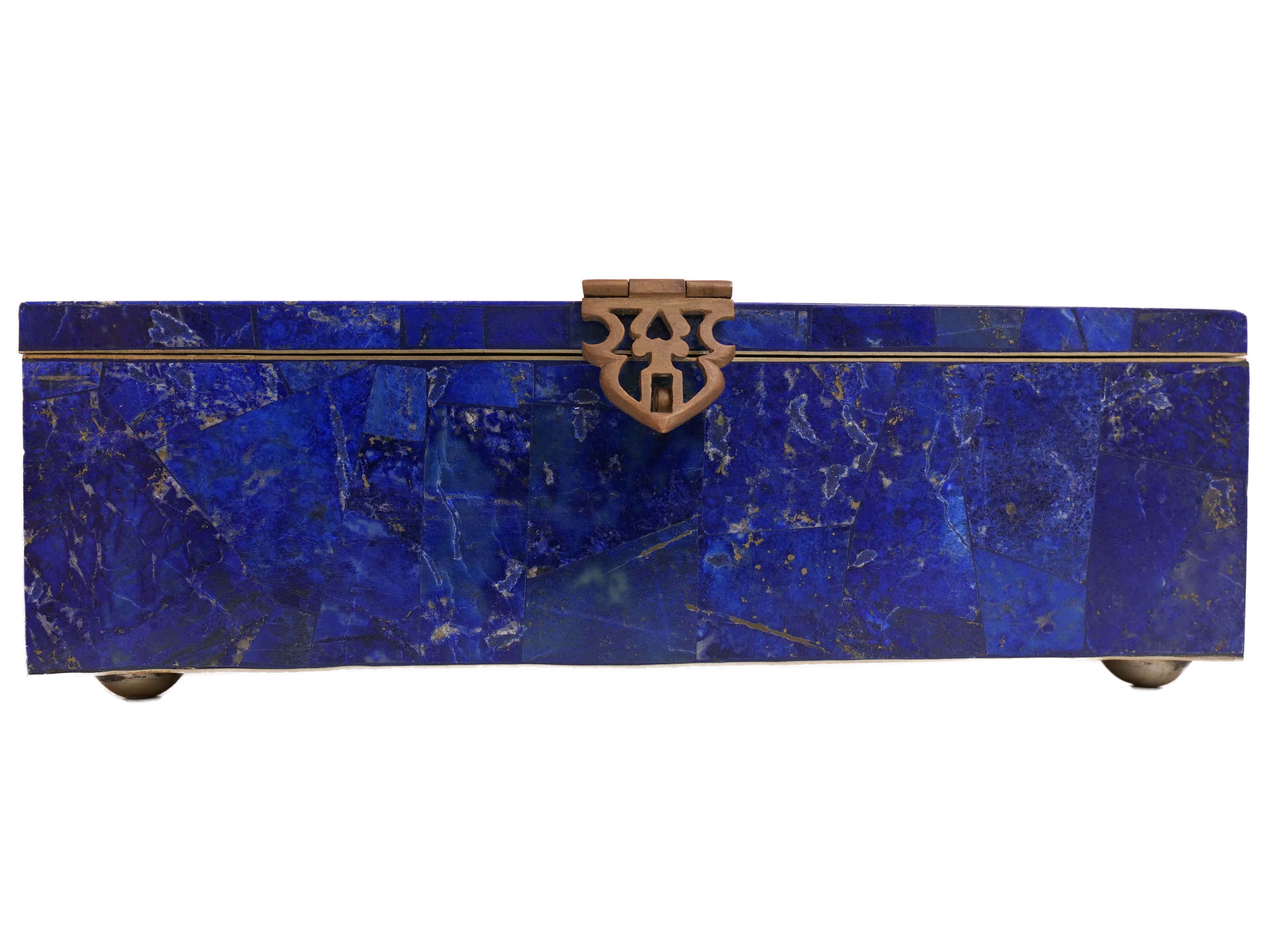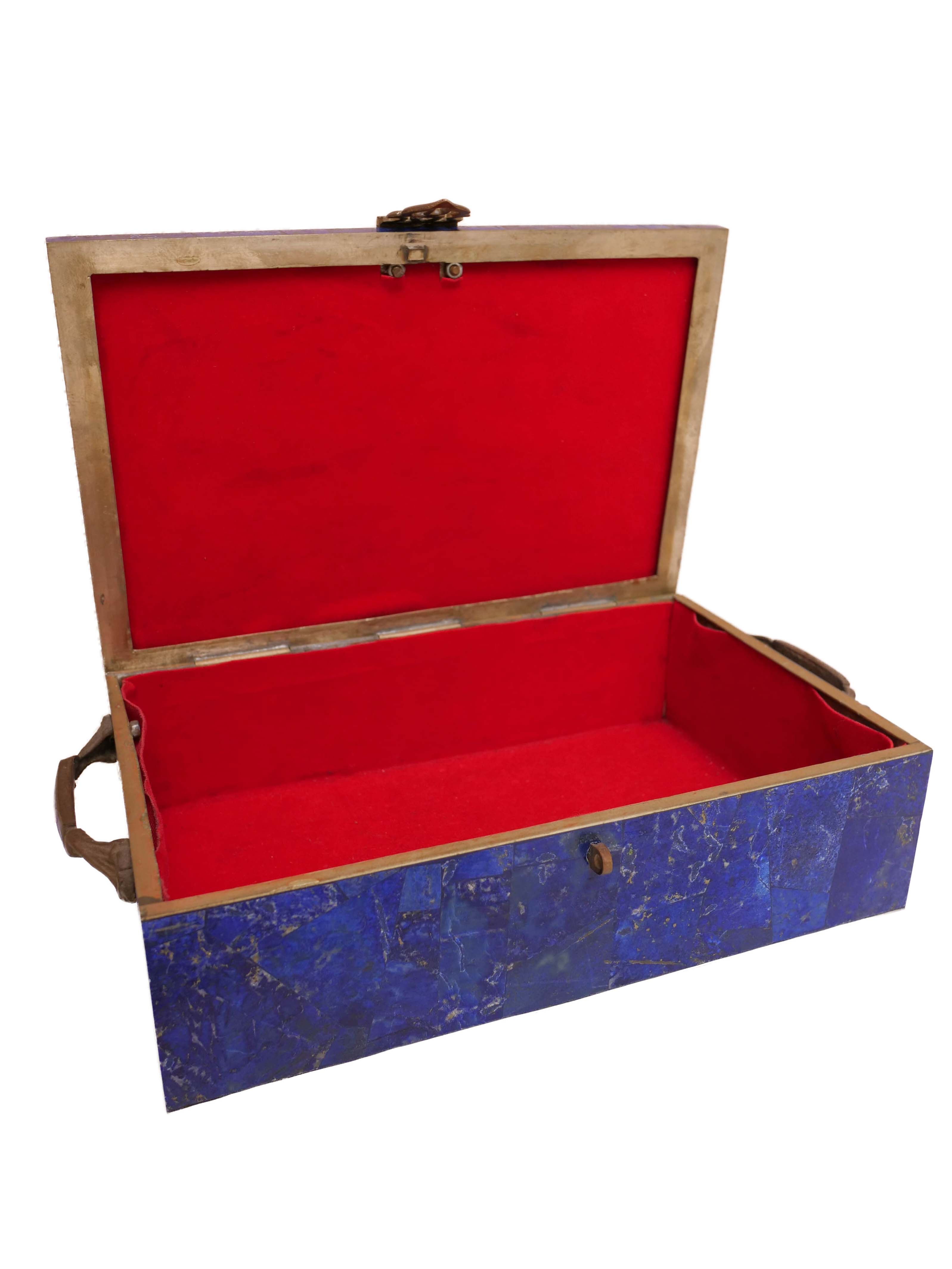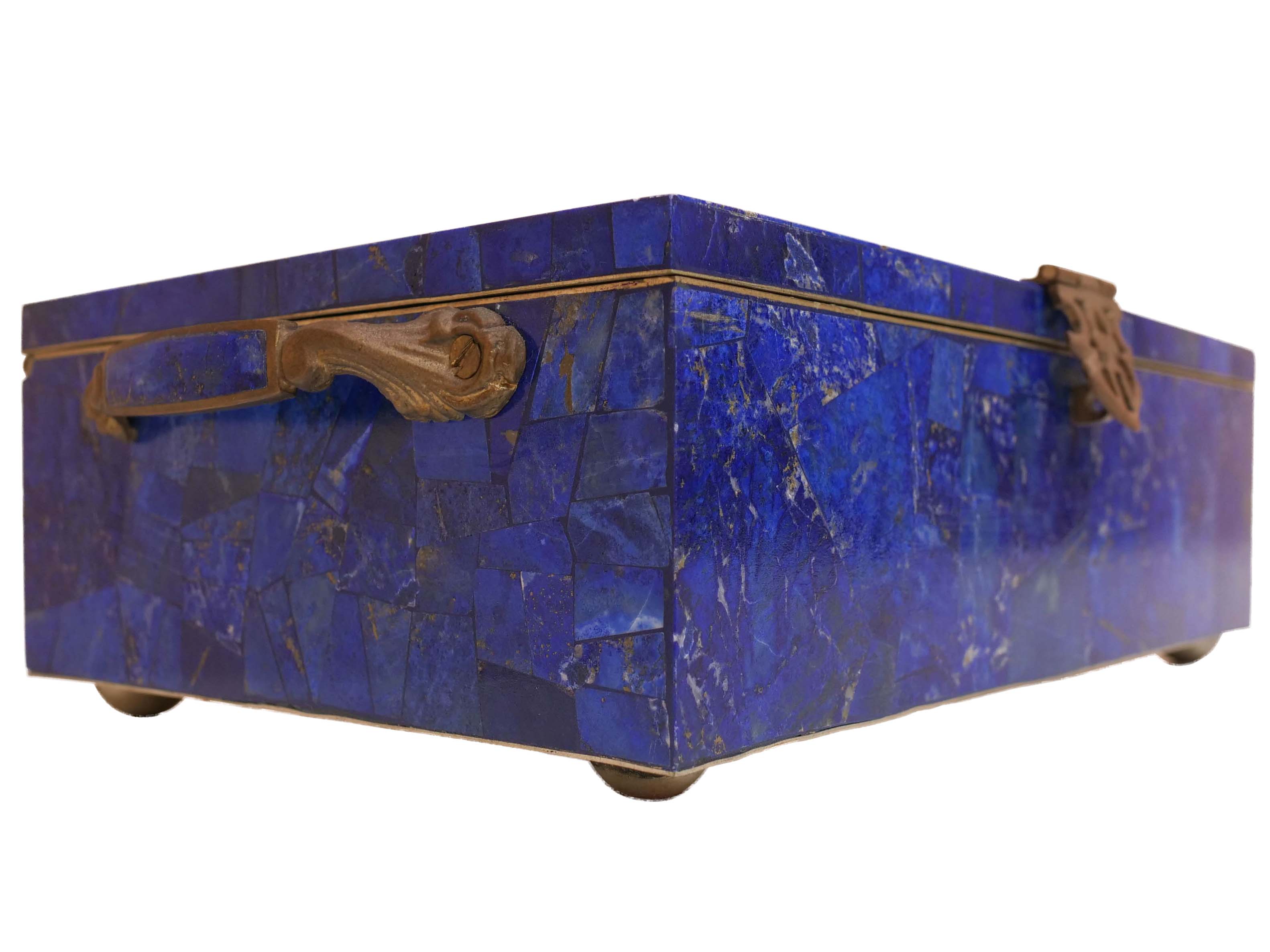 This hand-made semi-precious stone mosaic jewelry box is made from lapis lazuli, marble, and brown onyx. It probably took around 10 pounds of high quality lapis lazuli to build this box.
