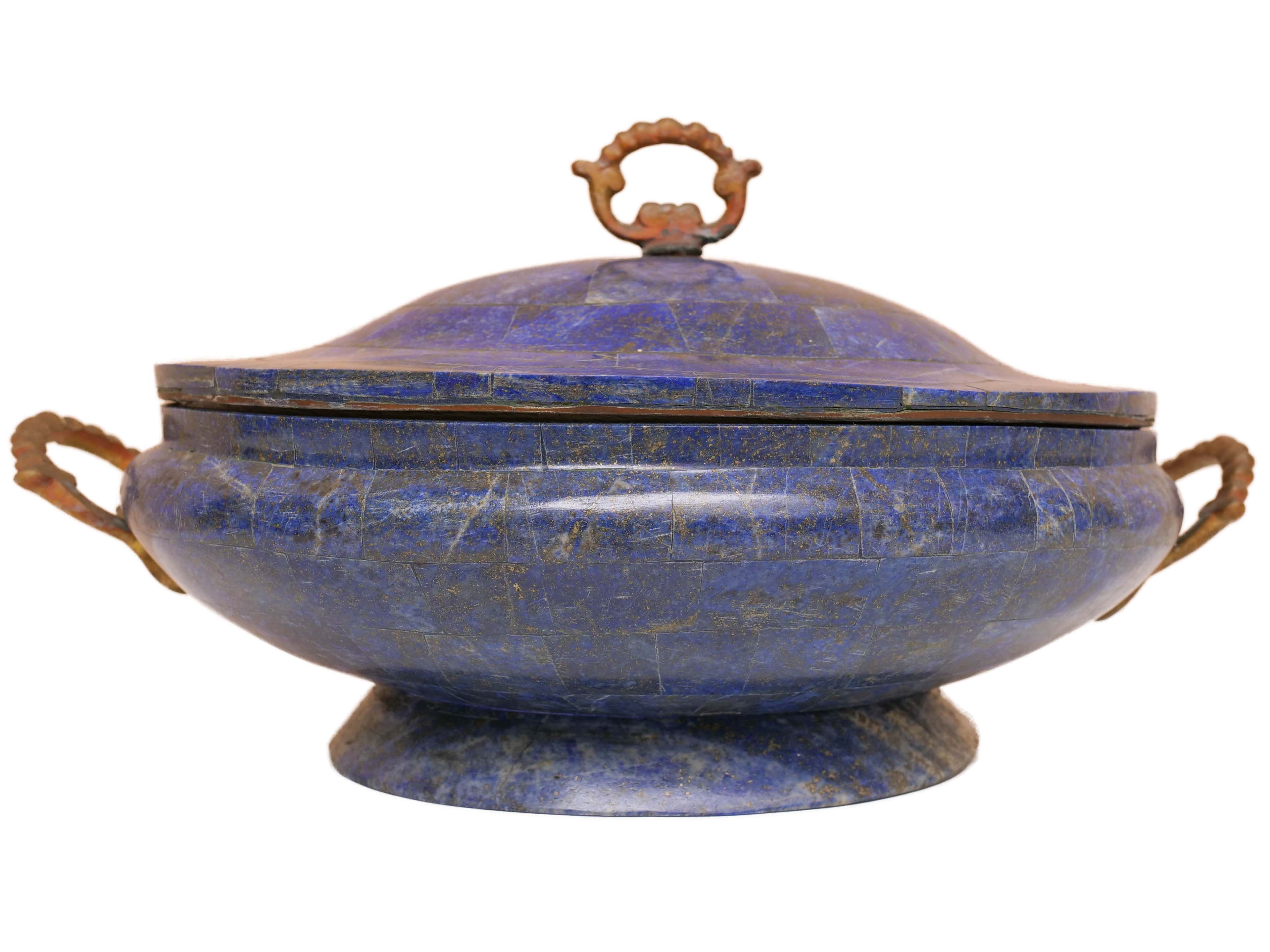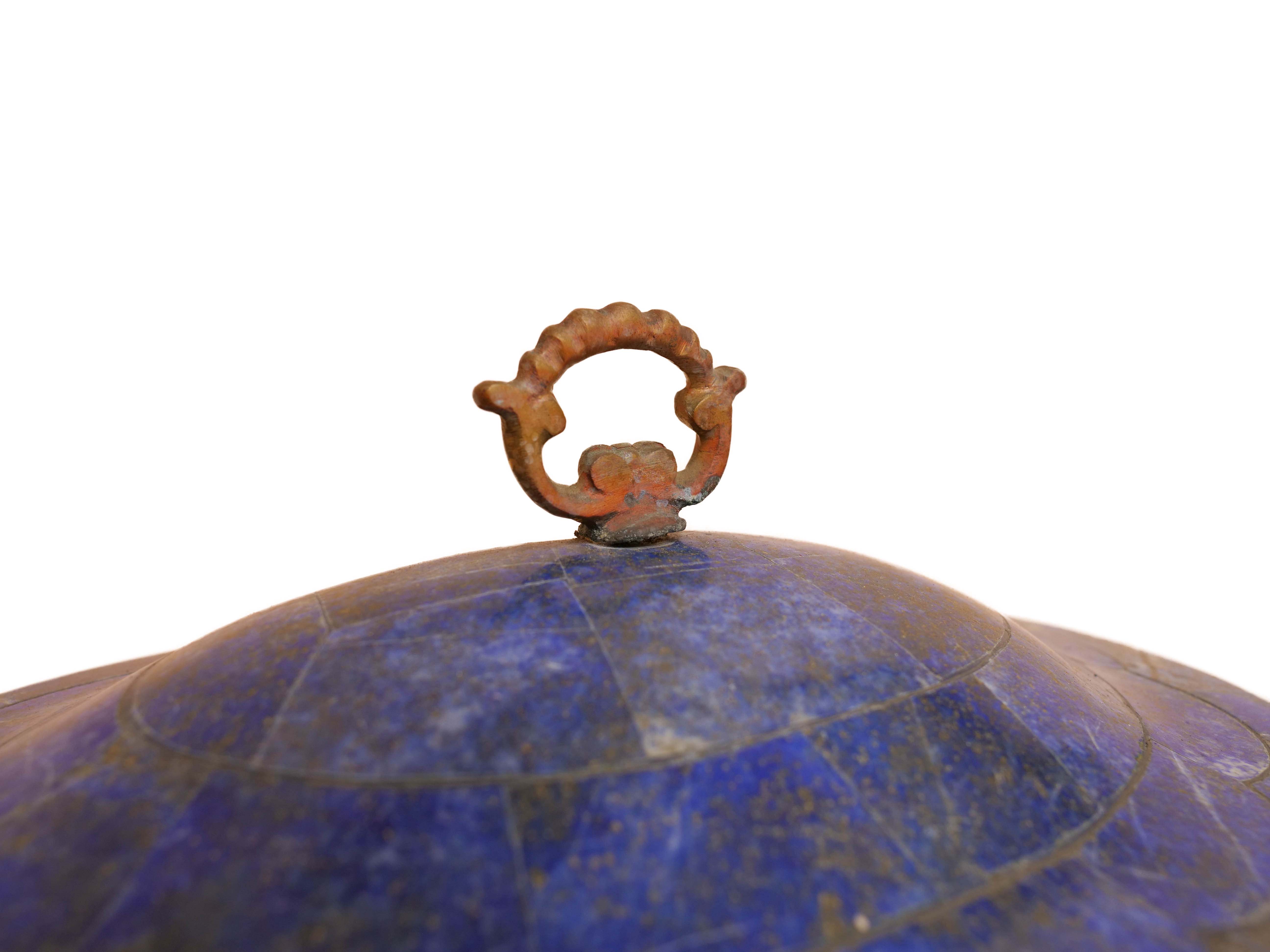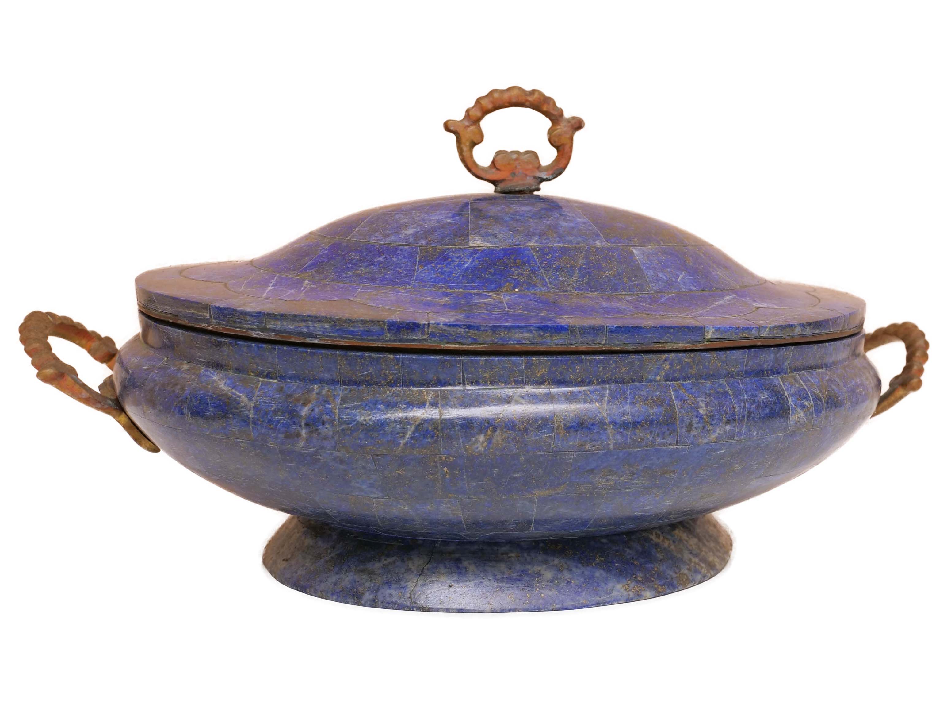 The base of the dish is made from one solid piece of lapis lazuli. This portion of the dish could have been made from brass or silver, but instead the original artist chose to use lapis lazuli. This was done to add beauty and value to the final piece.